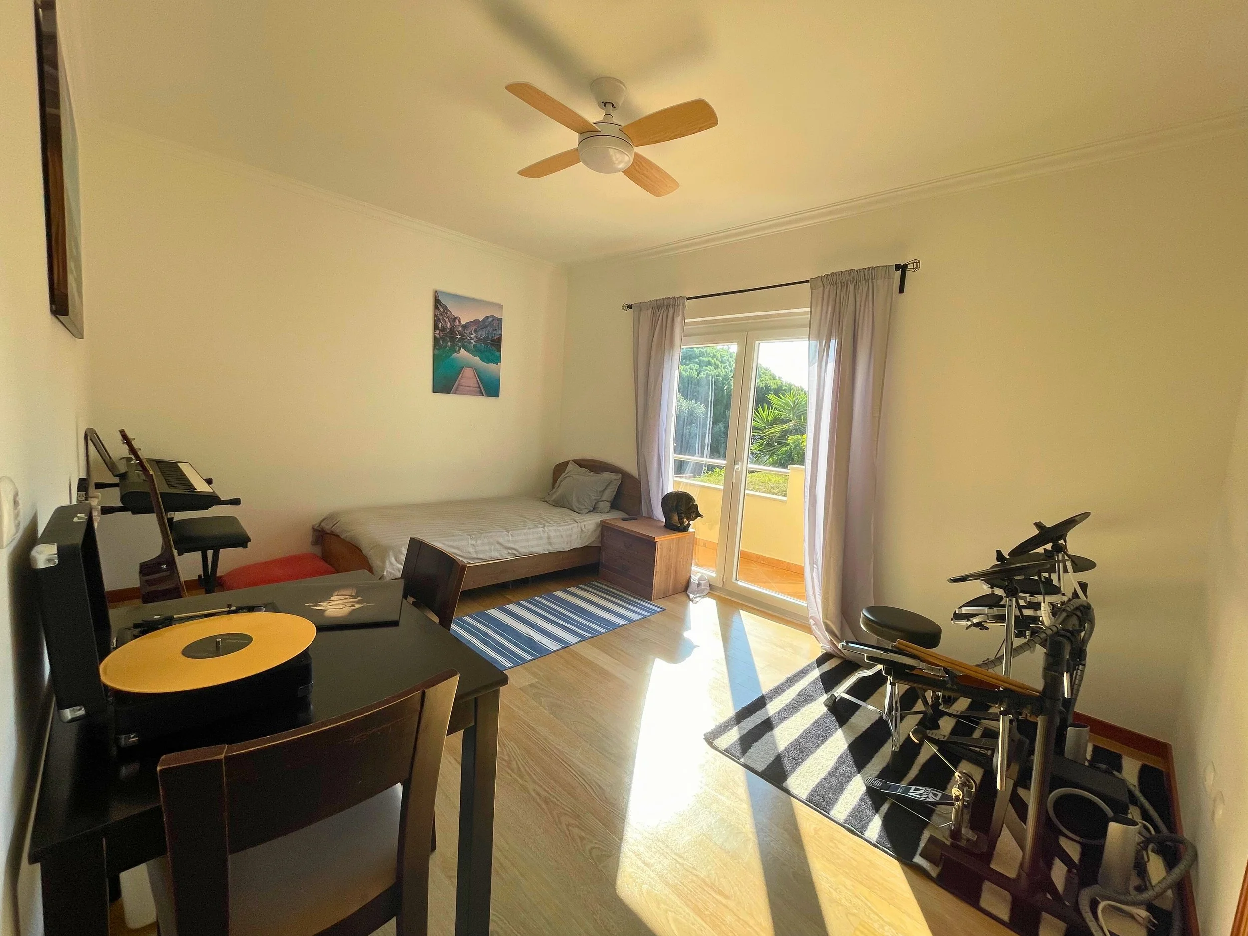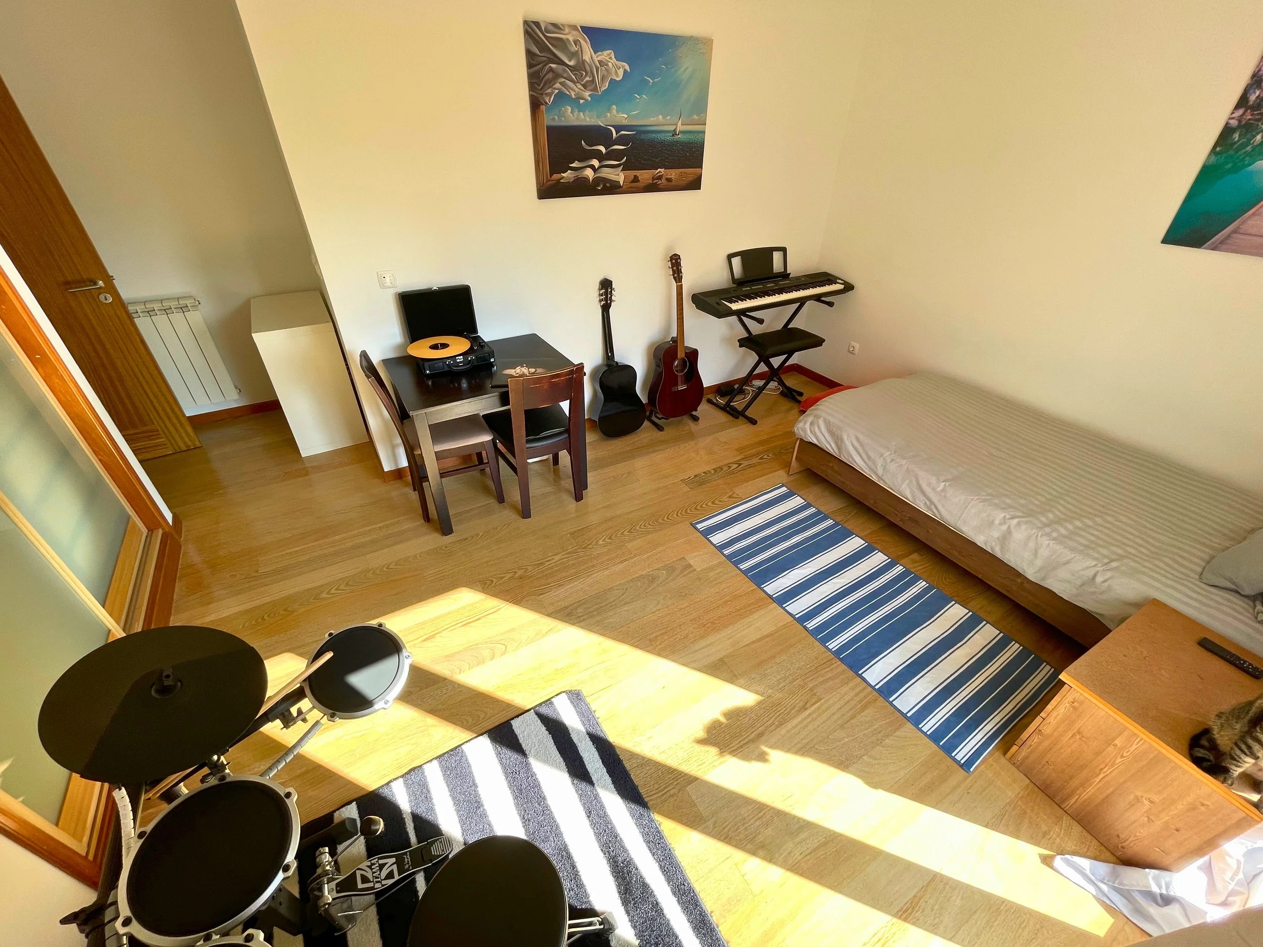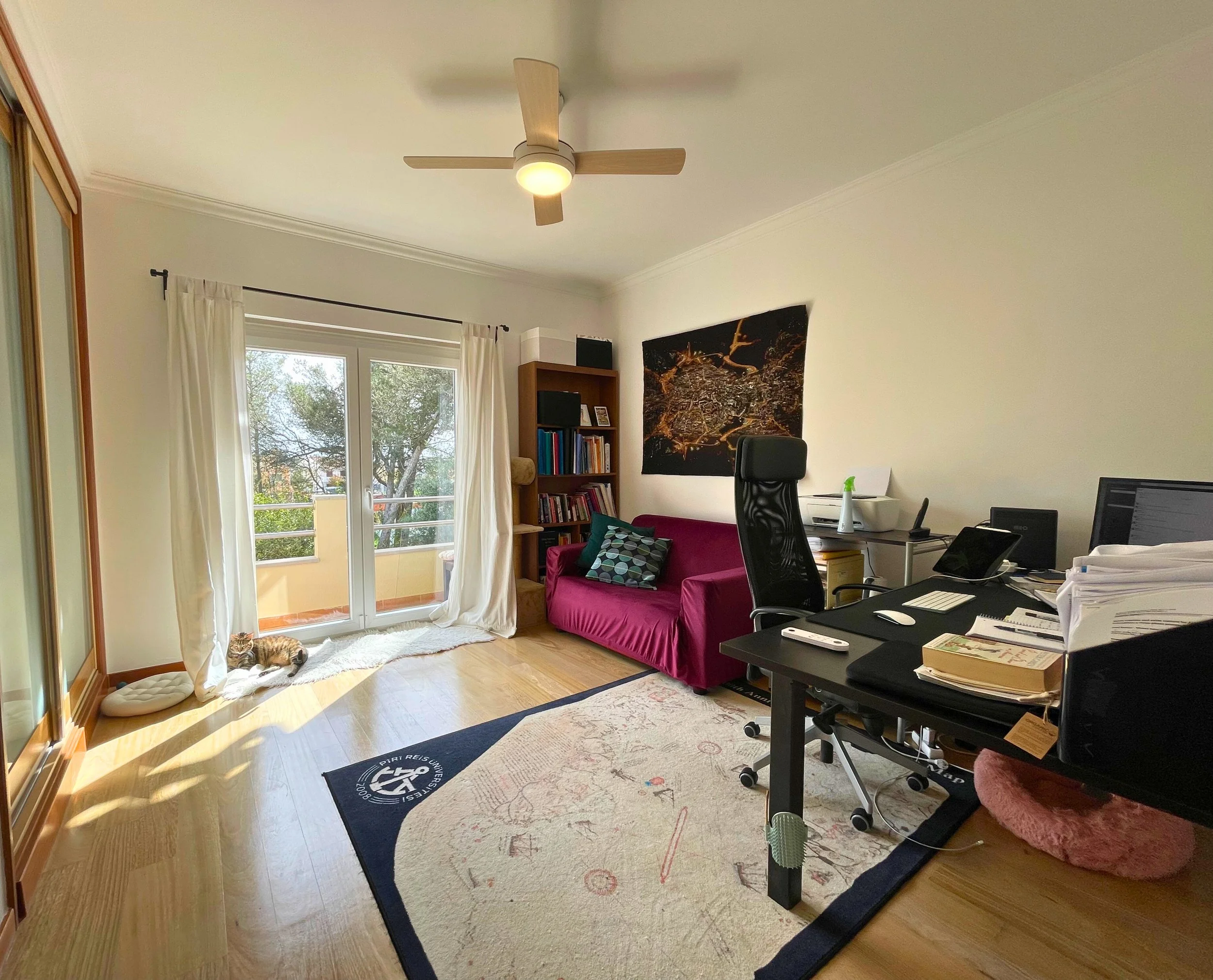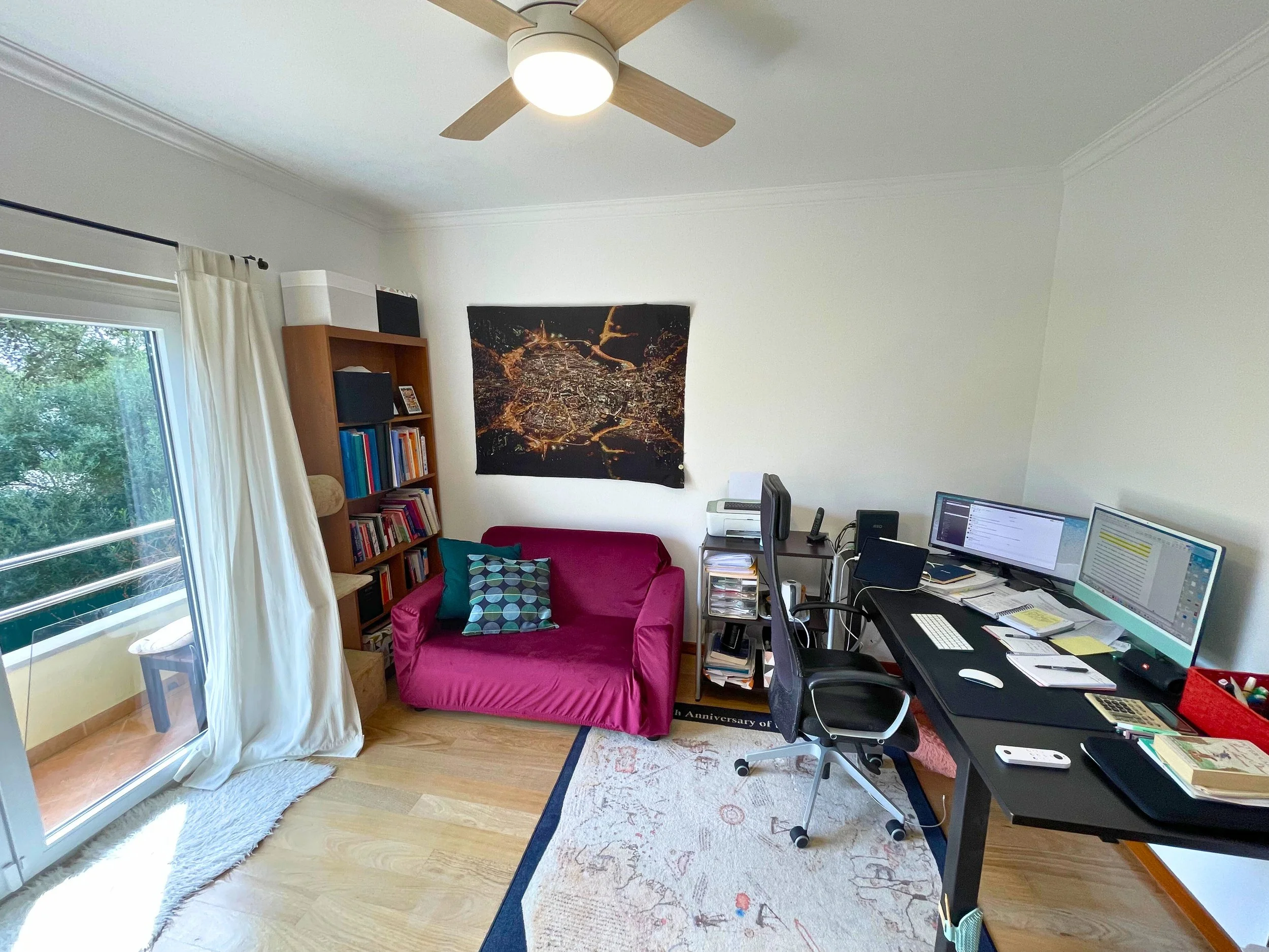 Sunlight streams into this ample south-facing bedroom, which enjoys year-round natural light and a tranquil green outlook. The built-in closet ensures plenty of storage while maintaining the room’s open and airy feel. Currently set up as a home office, the room’s versatile layout makes it well-suited for use as a bedroom or a workspace. Whether used for rest or productivity, this bright and inviting space benefits from a serene setting, abundant natural light, and seamless outdoor access.