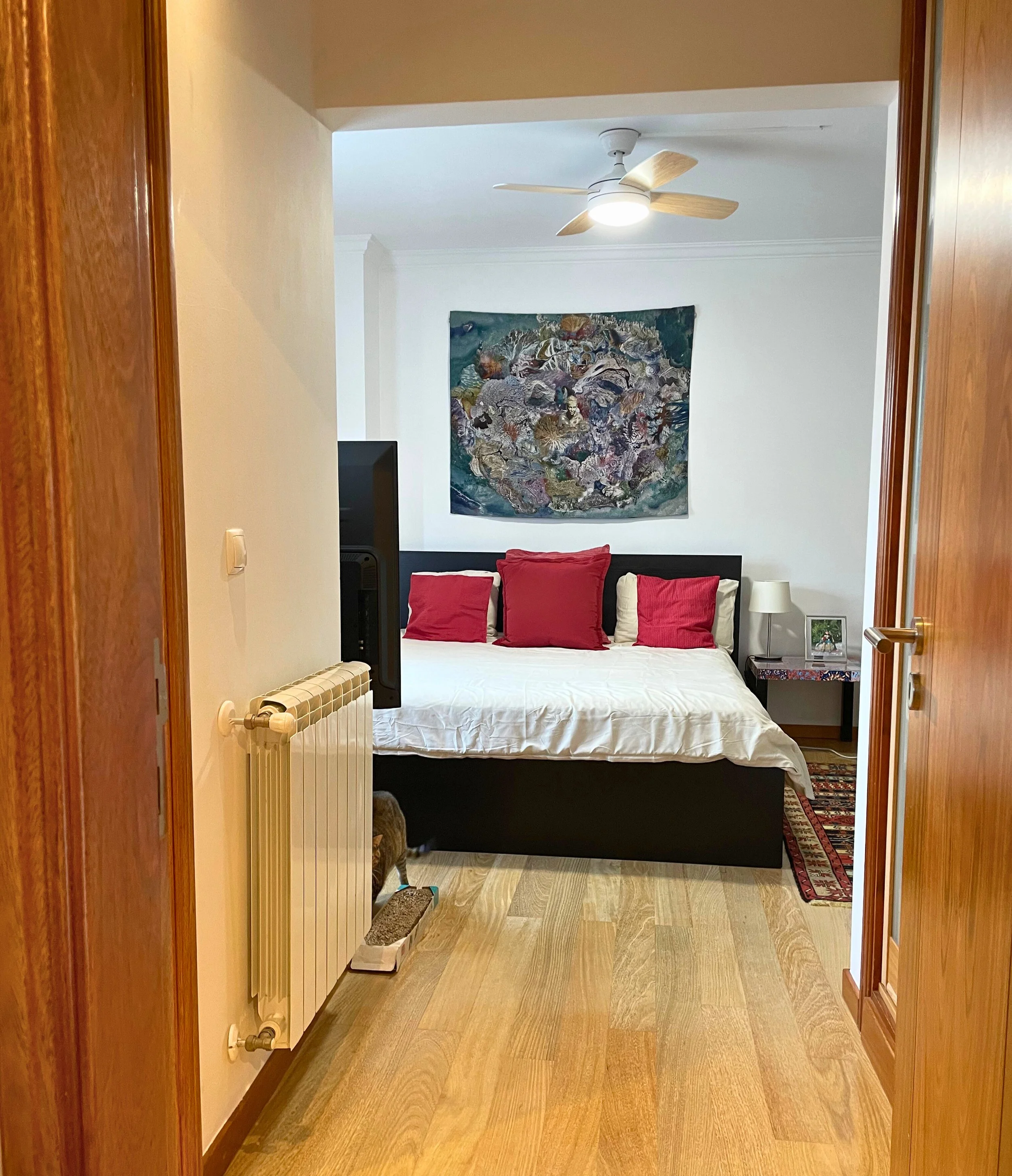 Flooded with natural light, this large south-facing bedroom stays warm and inviting in winter while remaining cool and comfortable in summer when the sun is higher in the sky. A ceiling fan provides additional airflow on warmer days. A built-in closet provides ample storage without compromising the room’s spaciousness., making it a versatile and functional space for a bedroom, home office, or creative studio. With its abundant natural light, outdoor space, and tranquil park views, this bedroom offers a rare blend of space, functionality, and connection to nature.